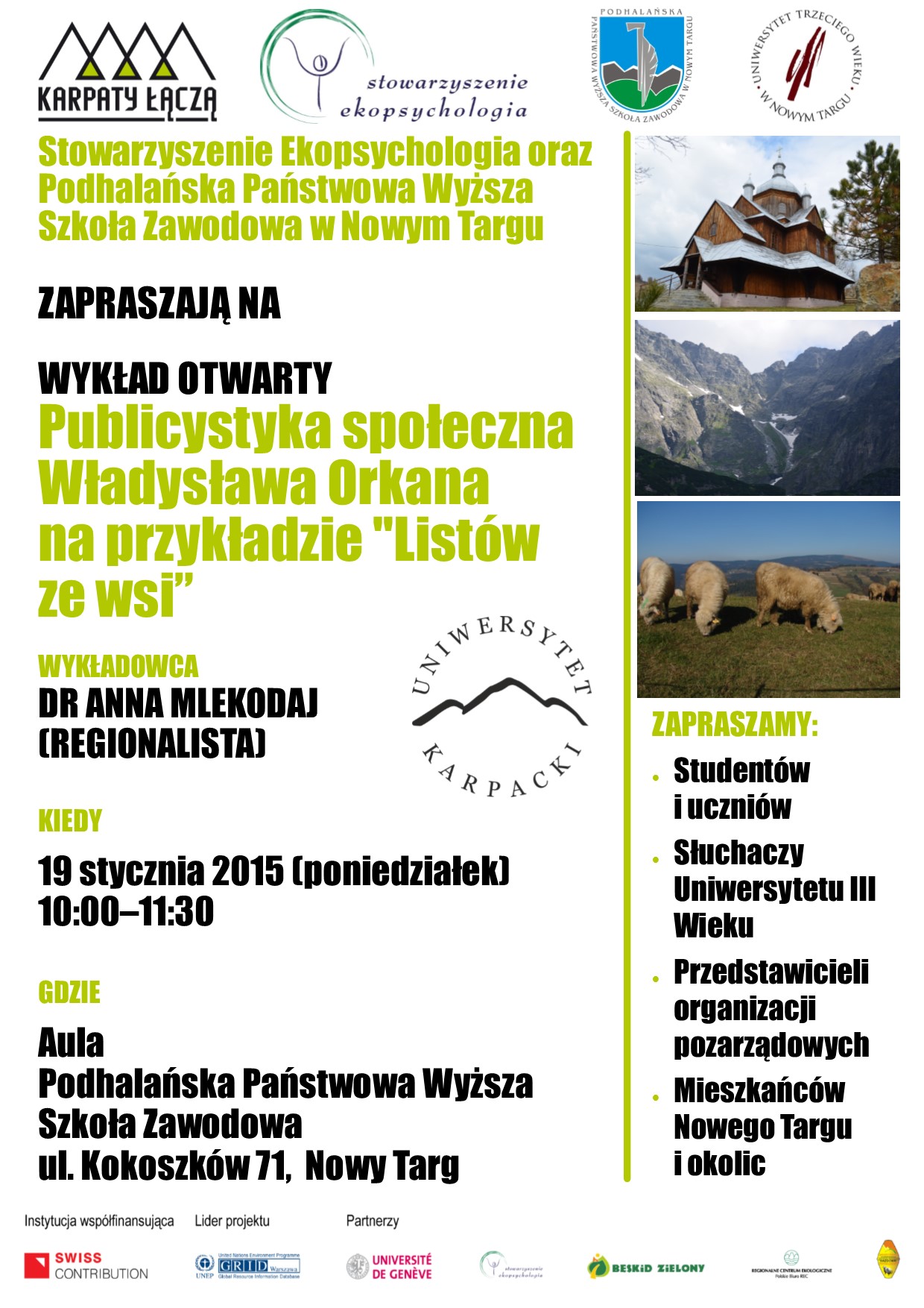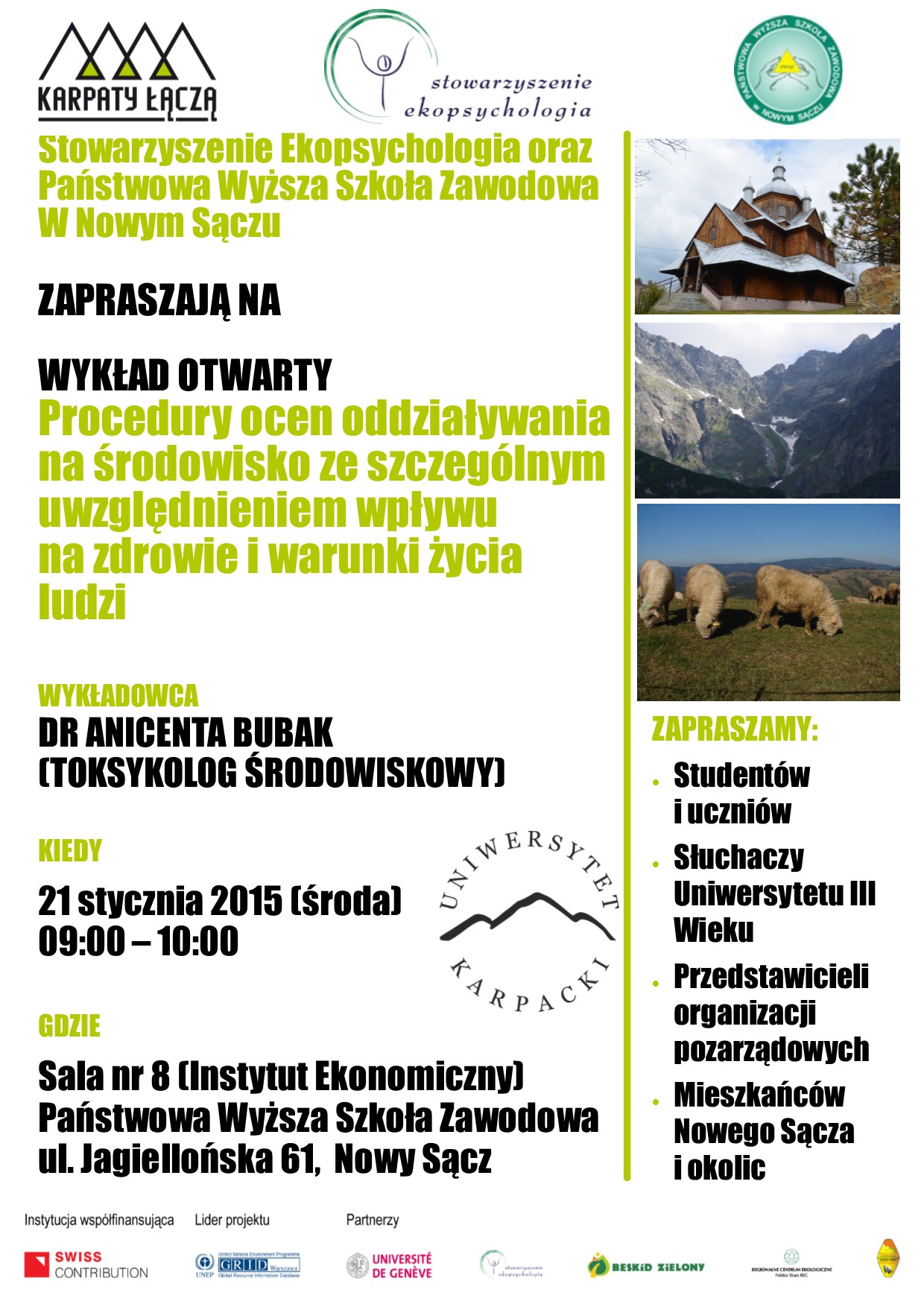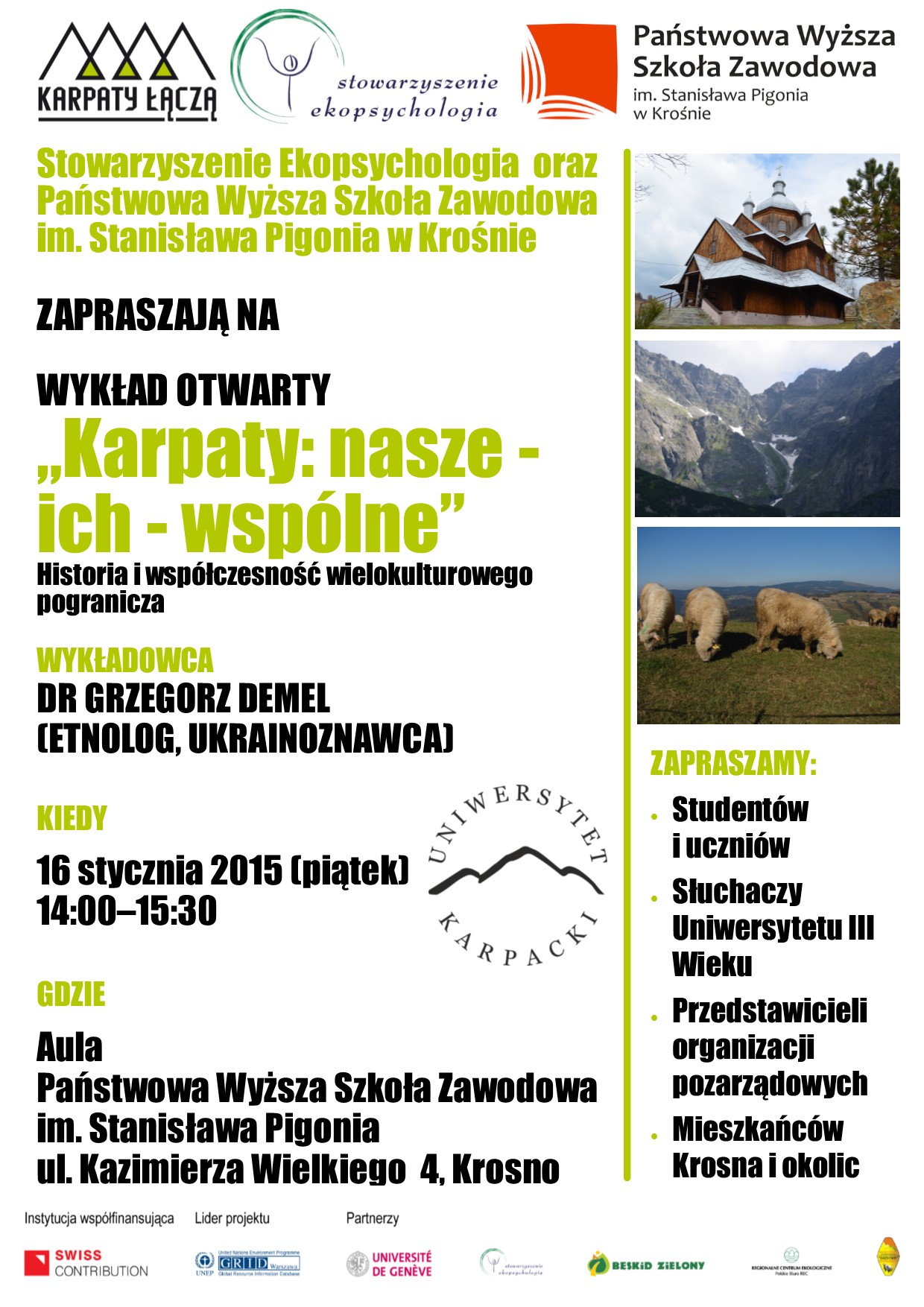Wykłady organizowane są w ramach projektu „Karpaty łączą - mechanizm konsultacji i wdrażania konwencji karpackiej”, współfinansowanego przez Szwajcarię w ramach Szwajcarskiego Programu Współpracy z nowymi krajami członkowskimi Unii Europejskiej.